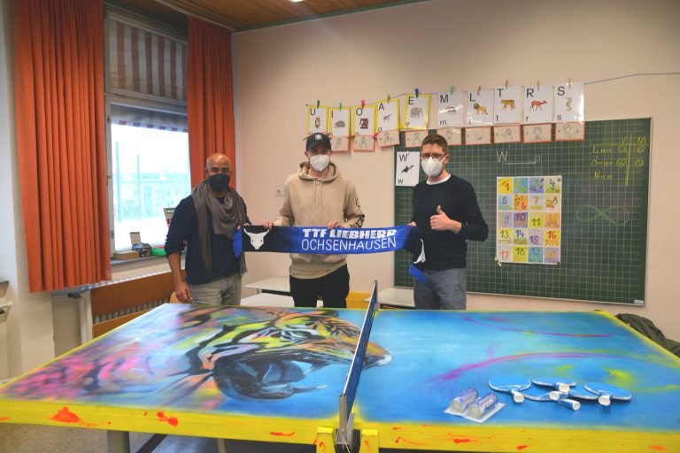 Vier kunst­voll gestal­te­te Tisch­ten­nis­plat­ten berei­chern den Schul­all­tag in Ulm – auch an der Hans-Zul­li­ger-Schu­le sorgt die Spen­de für Bewe­gung, Freu­de und neue Begegnungen.